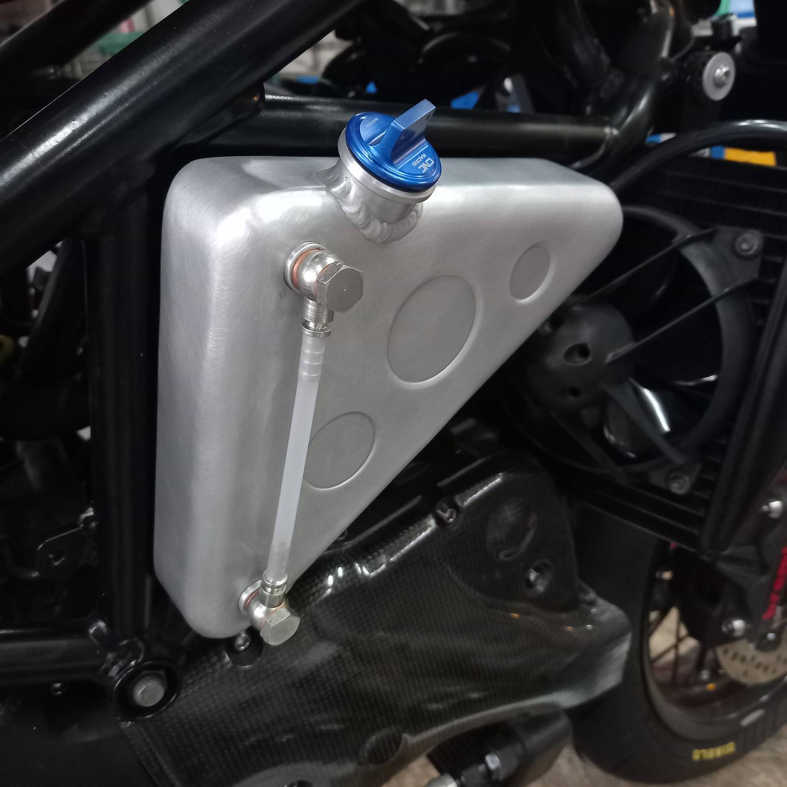Vaso di espansione per liquido di raffreddamento, realizzato in alluminio con attacchi a scomparsa.